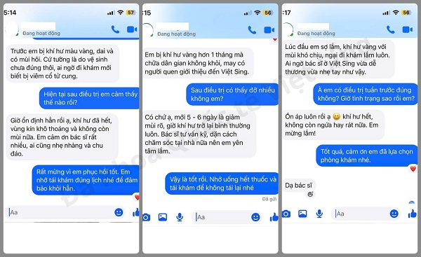 Sau khi hoàn tất quá trình điều trị, Việt Sing vẫn đồng hành cùng chị em qua hệ thống chăm sóc online chuyên nghiệp. Bác sĩ sẽ theo dõi tiến triển, nhắc nhở lịch tái khám, giải đáp thắc mắc và hướng dẫn chăm sóc tại nhà. Điều này giúp chị em yên tâm, hạn chế tái phát và duy trì sức khỏe vùng kín lâu dài. Đây là điểm khác biệt nổi bật, giúp người bệnh cảm nhận được sự quan tâm toàn diện, không chỉ khi tới phòng khám mà cả sau điều trị.
