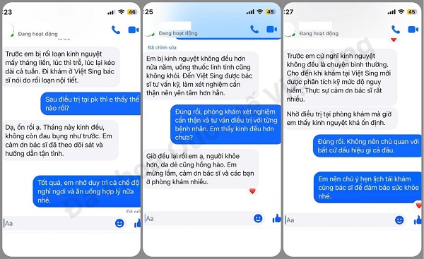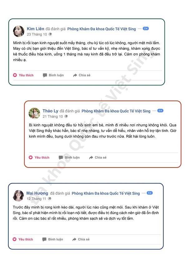 Bạn L.A (25 tuổi, Từ Sơn): “Mình từng tự uống thuốc điều hòa kinh mua online nhưng không khỏi, còn bị đau bụng nhiều hơn. Đến Việt Sing khám, bác sĩ giải thích rõ nguyên nhân do viêm nhẹ tử cung, sau khi điều trị thì hiện giờ kinh nguyệt đều, không đau nữa. Phòng khám sạch sẽ, nhân viên dễ thương, rất thoải mái.”