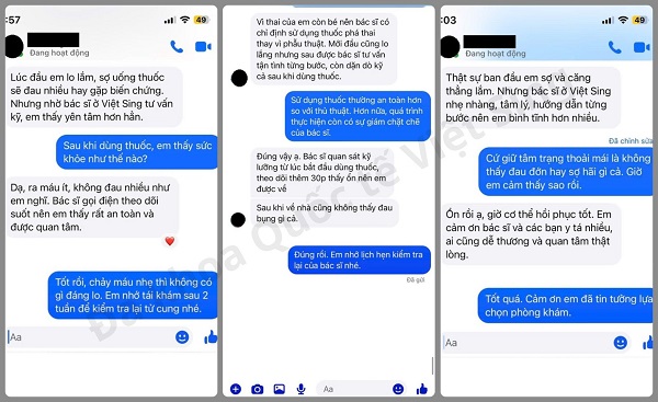 Chị N.T.H (25 tuổi, Hoàng Mai): “Mình thật sự rất lo lắng khi quyết định đình chỉ thai bằng thuốc vì nghe nhiều người nói dễ đau và ảnh hưởng sức khỏe. Nhưng ở Việt Sing, bác sĩ tư vấn kỹ càng, giải thích từng bước nên mình thấy yên tâm hơn. Quá trình uống thuốc được theo dõi chặt chẽ, có bác sĩ gọi điện hỏi thăm sau đó nữa. May mắn là cơ thể mình hồi phục nhanh, không có biến chứng gì.”